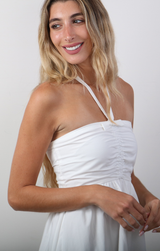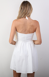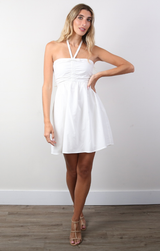 A sweet babydoll dress for any event! Perfect for the bride to be or for your next weekend date night. Featuring a halter neckline, fitted bust, flared our mini skirt and a bright white hue. Style with heels and gold jewelry.