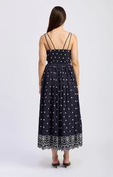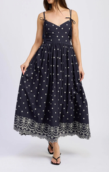 This charming midi is the perfect transitional piece to carry you into fall! Featuring a self-tie neckline, a midi length, embroidered scalloped hem with eyelet detailing, and a voluminous and flattering tiered skirt. Pair with a raffia handbag and gold hoops.