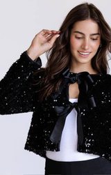 This eye-catching top is a total gem. Perfect for the holiday season, it features long sleeves with gathering at the cuffs to offer a feminine silhouette and a front-tie closure that creates bow details at the front, all finished with glamorous black sequins throughout to catch the light at your next special event. Style with a silky black slip skirt and heels for a stunning winter look!