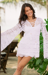The Noah Tunic is a breezy, bohemian-inspired piece perfect for layering over swimwear. Featuring intricate lace detailing and open-weave crochet, it’s finished with lace-up tassel ties at the neckline, long sleeves, and a scalloped hem for a feminine touch.