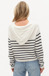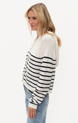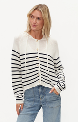 A cute lightweight cotton knit featuring ling sleeves, open button up front, hooded style, drawstring neck and classic navy stripes. Style with light wash denim and sneakers for a chic on the go look.