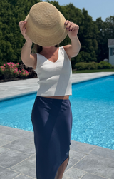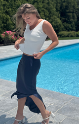 We love a summertime knit tank for any day! Featuring a v neckline, ribbed detailing, cropped length, fitted body and a soft beige color. Style with a comfy maxi skirt and sandals.