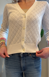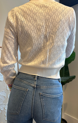 An easy to wear v neck cardi featuring long sleeves, intricate stitching, relaxed fit and a soft white. Style with classic denim and sneakers for an on the go weekend look.