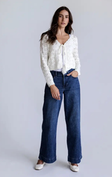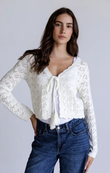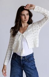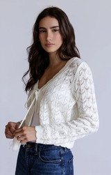 A cute cardi to perfectly top off every look! The Mariella cardigan features an open knit pattern with subtle chevron texture throughout, a front tassel self-tie closure, scalloped edges at the hem and neckline, and a relaxed fit. Perfect for transitional layering and warm-weather wear!