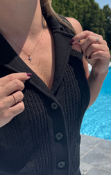 A classic style in an updated summer silhouette. Featuring intricate cable knitting, wide collared v neck, button up front and a relaxed yet flattering it. Style with simple light wash denim and loafers for a clean and polished everyday vibe.
