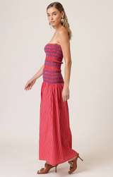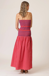A true statement piece for your next summer event. Featuring a lightweight poplin, dramatic smocked top, strapless design, light summer stripes and a maxi length skirt. Style with heels or sandals and some chic gold jewelry.