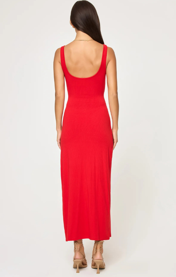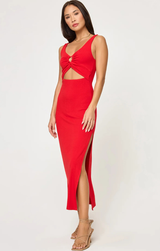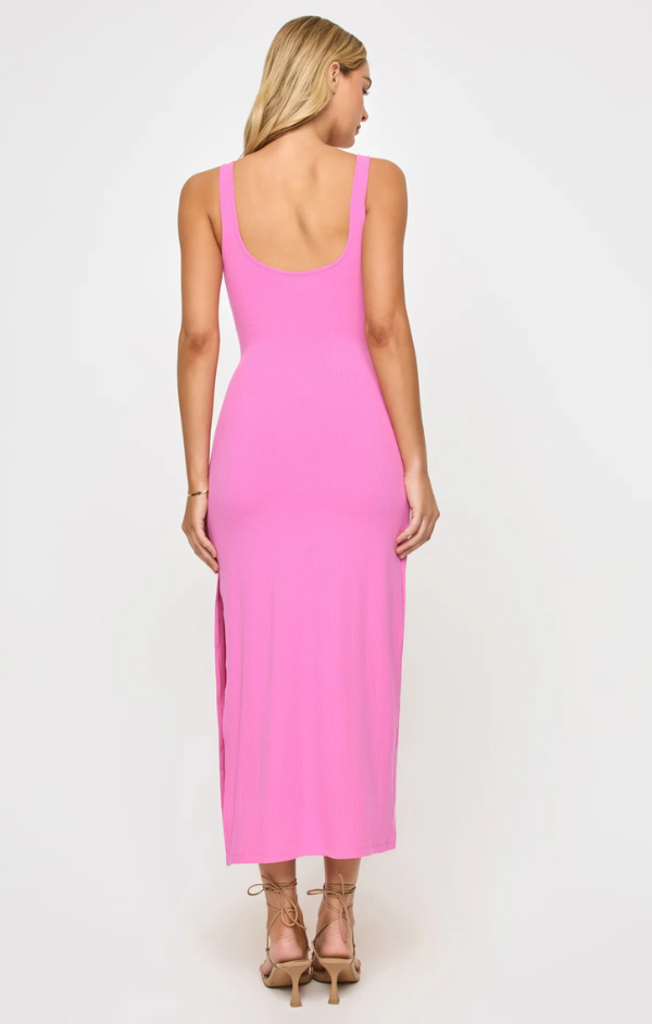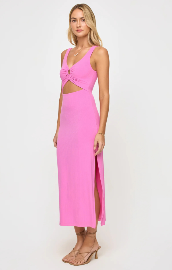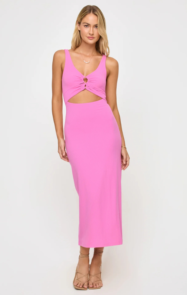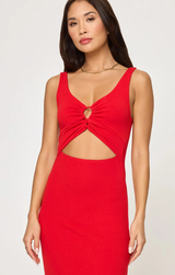 A summer staple to dress up or wear with your everyday rotation. Featuring flirty front loop cutouts, a scoop neck, side slits and thick straps. The fitted ribbed knit is ultra flattering, hugging your curves in all the right places. Style with strappy heels and gold jewelry for a warm-weather ready look or style over your bathing suit with sandals for a casual summer look.