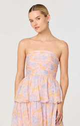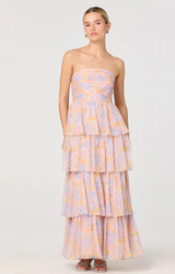 The Anisha Dress is a dreamy escape in soft orange and lavender hues. This strapless maxi features romantic tiered layers that dance with every step, ideal for vacation getaways and spring adventures. Effortlessly elegant and undeniably feminine, it's the perfect piece for those seeking understated sophistication with a touch of whimsy.