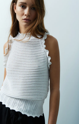 The Rana Sweater Top is a comfortable transitional knit with a flirty twist. Featuring knit ruffle details at the shoulders, neckline, and hem, full length, and ribbed accents at the neckline and hem. Try pairing the Rana with light wash wide leg leans for a transitional ensemble that gives serious it-girl energy.