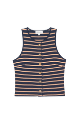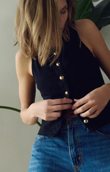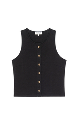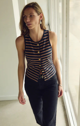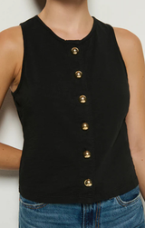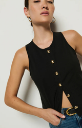 This simple yet chic versatile tank goes a long way. Featuring a sleeveless style, crew neckline and functional placket with Nation's signature gold buttons imported from Italy. Button up fully or leave a few buttons undone for a polished and relaxed vibe. Style with belted denim and boots for a clean look.