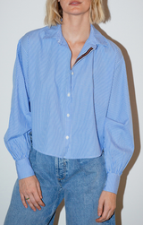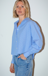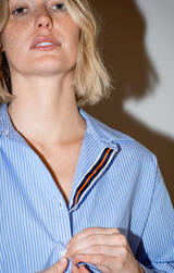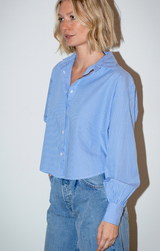 The Cali Shirt is your go-to boyfriend button-up that actually fits just right. Dressed in a timeless blue and white pinstripe, it's got long sleeves and a relaxed silhouette that works whether you're buttoned up or thrown open over a tank. Versatile, effortless, and way more fun than borrowing his closet.