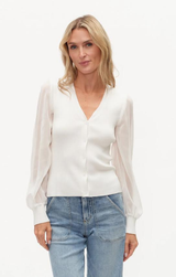 Add an angelic touch to your transitional wardrobe. Featuring a button-front closure so you can style it your way, a flattering V neckline, and a ribbed knit bodice that hugs all the right places, all finished with unique sheer long sleeves with puffed details. Style with anything from wide leg denim to a satin midi skirt!