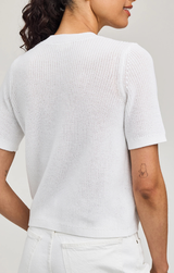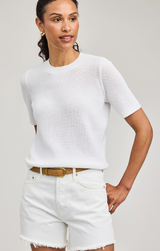 A chic short sleeve knit for endless styling options for the new season. Featuring longer length short sleeves, crew neck, relaxed fit and a bright white hue. Style with everyday denim and sandals.