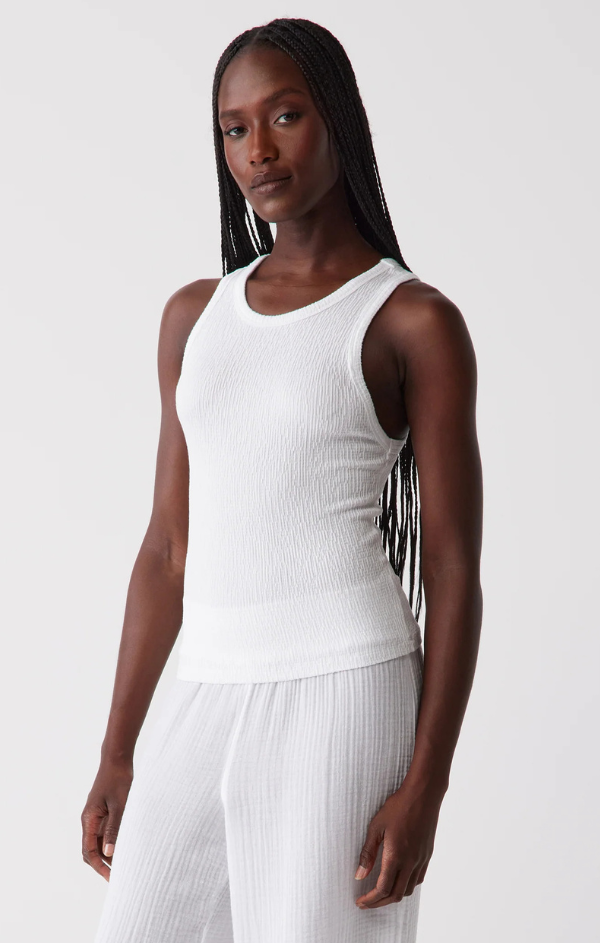 The perfect fitted tank for summer has arrived. We will be wearing this one on repeat. Crafted from a soft crinkle knit fabric made from a textured rayon blend and featuring a classic crew neck, sleeveless style and a bodycon figure flattering fit.