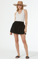 Fun, flirty and so on trend. The bubble hem skirt is the "it" skirt for summer. Featuring a pull on style, elasticized waist, mini length and a bold black color. Style with a simple tank and slides for a perfect summer vibe.