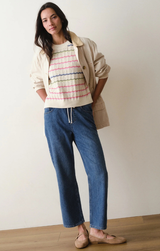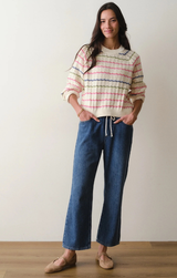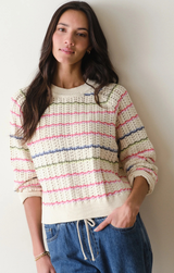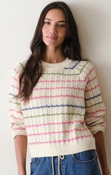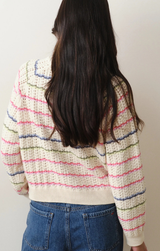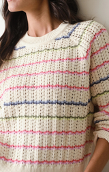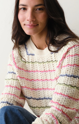 Say hello to your new favorite cozy companion, the Mina Pointelle Sweater. This adorable knit features a delicate pointelle stitch that adds texture and visual interest, while cheerful rainbow stripes bring instant joy to your wardrobe. The crew neckline and long sleeves offer classic comfort, and the slouchy fit is pure relaxation in sweater form. Perfect for layering or wearing solo, it's the kind of piece that makes you smile every time you put it on.