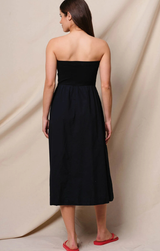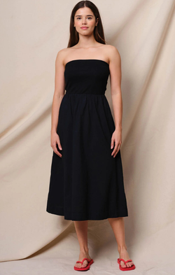 Simple, chic, and summer-ready. This easy dress features a strapless neckline, a flattering fitted bodice, flowy gathered skirt, and practical side pockets for your essentials. Pair with gold jewelry and a raffia handbag for a summer look that's ready to go anywhere.
