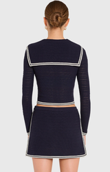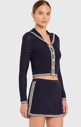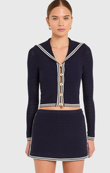 The Monique Cardigan stuns as a set or shines on its own. Featuring long sleeves, a functional button-front closure complete with chic gold buttons, a nautical-inspired shawl neckline, and contrast striping throughout the collar, cuffs, front closure, and hem. Pair with the Monique Dress for the cutest transitional set or simply layer over a tee and jeans.