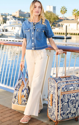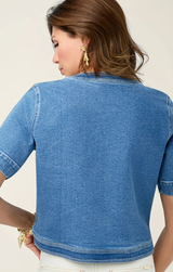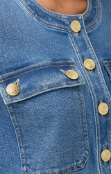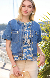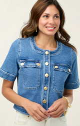 The piece you need from any spring, summer or vacation look. This denim short sleeve jacket makes the perfect layering piece over a flowy dress or sweet short set. Featuring a button up front, chest pockets, vintage wash and a structured fit.