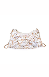 Shimmer through the night with this show-stopping evening bag featuring cascading iridescent discs that catch every light. The removable long strap gives you versatility, wear it over your shoulder for hands-free elegance or detach it to transform into a sleek clutch. Perfect for cocktail parties, galas, or any occasion where you want to make a dazzling entrance. Compact yet spacious enough for your essentials, this playful piece proves that functional fashion can absolutely sparkle.