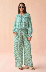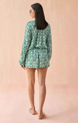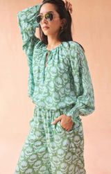 A feminine and comfortable blouse to wear all spring and summer long. Featuring a breezy fit, long peasant sleeves, delicate pleated details, adjustable neckline and a matcha green print. Style with the matching shorts and sandals.