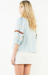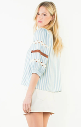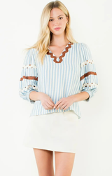 Introducing the Shayla Puff Sleeve Striped Top—your new favorite for effortless charm. Soft light blue stripes create a timeless, breezy vibe, while romantic puff sleeves add a dash of whimsy to your everyday look. The flattering V neckline pairs perfectly with textured trim detailing that catches the eye, and the relaxed fit ensures you stay comfortable all day long. Throw it on with your favorite bottoms and instantly elevate your style with understated elegance and playful flair.