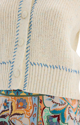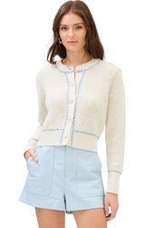 A classic cardigan style sweater that is a perfect addition to your spring knits. Featuring a sweet blue trim, button up front, long sleeves, crew neck, relaxed fit and a soft white color. Style with chic printed skirt or classic cut off shorts.