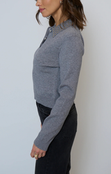Your classic knit polo with an edgy twist. Featuring long sleeves, studded collar detailing, button v neck, relaxed fit, subtle stretch and a charcoal grey. Style with dark wash denim and a light jacket.