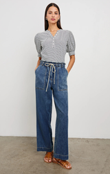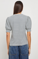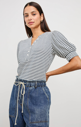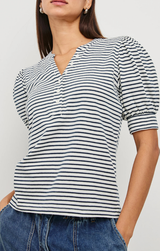 A sweet take on the classic tee. Featuring a cute puff shoulder, henley style front, luxe rib Pima cotton and soft navy stripes. Style with denim jeans and flats for a casual yet polished vibe.
