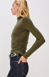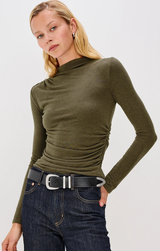 A sleek, modern take on the classic long sleeve top. Made from soft gauge jersey with an asymmetrical mock neck details, fitted body and sleeves and a soft heather olive hue. The perfect layering piece for the cooler seasons. Style with straight leg, high waist jeans and boots for a chic and polished everyday look.