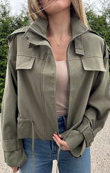 The Marlene is a classic utility-style coat with a twist! Featuring a cropped length with adjustable cinching at the bottom hem, long sleeves, front chest pockets, and a belted detail around the collar. Layer over a tee and jeans for an edgy winter look or pair with all your fall dresses!