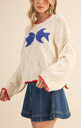 Cute lil' fish on an easy pullover sweater that can be styled year round. Featuring a crew neckline, oversized fit, ribbed details, red and blue pops of color and drop shoulders. Style with a classic denim jean and sneakers for a styled up everyday vibe.