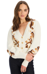A neutral touch of florals for your cool weather rotation. This classic chunky cardi features a v neckline, covered buttons, fitted cable knit bottom band, and a relaxed fit. Style over a denim mini dress or wear casually with denim jeans and boots.