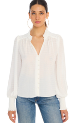 A classic silhouette blouse that instantly elevates any look. Cut in a lightweight jacquard fabrication and featuring split v neckline, mandarin collar, pearl button up front, cuffed sleeves and a relaxed fit. Style with everything from the Beaded Dawn mini skirt to Frame denim jeans.
