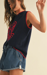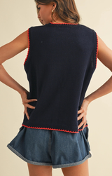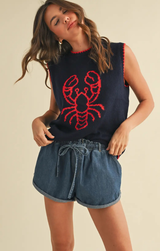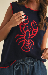 A cute oversized vest for all year wear. Featuring bold red embroidery and trim, crew neckline, deep navy hue and a sweet lobster detail. Style now over a fitted long sleeve top and denim or wear in the warmer weather with shorts and sandals.