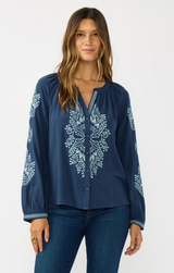 This versatile blouse is ready to go from the office to dinner in an instant. Crafted from a breathable linen cotton blend, this fall-ready blouse features a split neckline, a clean finished button front placket, intricate embroidery along the front and sleeves, long raglan sleeves with neat turn back cuffs, gentle shirring at the neckline, and a clean finished hem. Pair with slacks and a blazer for the office or create a cheeky look with a leather jacket and heels.