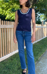 The perfect knit tank to style now and later. Featuring a cute scoop neck, white stripe detail, sleeveless design, ribbed fabric and a stretchy fit. Style with denim and slides.