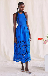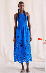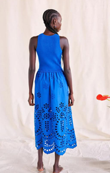 From dawn to dusk, this versatile midi has you covered. Featuring a sleeveless silhouette, classic crew neckline, midi length, and a knit and eyelet mixed media construction all finished in 100% cotton in a stunning cobalt shade. Pair with your favorite sunhat and sandals for a casual vibe or dress it up with heels!