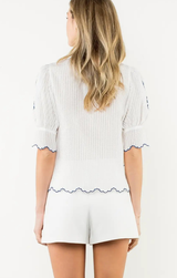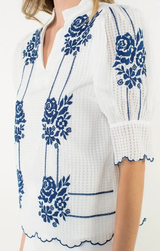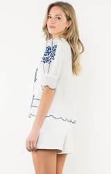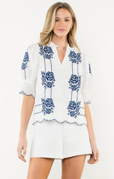 Say hello to the Nellie Puff Sleeve V Neck Top, where feminine charm meets everyday wearability. Romantic puff sleeves frame your shoulders with playful volume, while a delicate V neckline flatters and elongates. Intricate floral embroidery adds a touch of artisanal beauty, perfectly complemented by scalloped trim that dances along the edges. Layer it, tuck it, or wear it solo—this versatile top brings instant personality to your closet and pairs beautifully with everything from denim to skirts. Pure joy in fabric form.