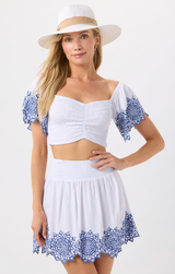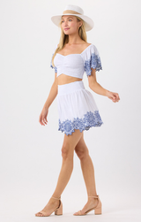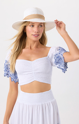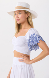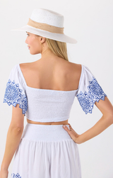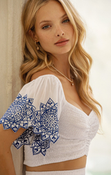 Say hello to the Salty Top, your new favorite piece for effortless charm. This delightful crop top features romantic flutter sleeves that dance with every move, paired with an elegant sweetheart neckline. Intricate white and blue embroidery adds a touch of whimsy, while the smocked bust creates a flattering, defined silhouette. The easy, relaxed fit means you can wear it all day without a care. Dress it up or keep it casual, this top does both beautifully.