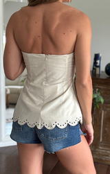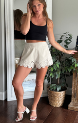 Eye-catching eyelets complete this one-and-done look! Featuring a cropped tube-style top with eyelet details at the hem, paired with a coordinating pair of shorts also adorned with eyelet details and a back zip closure. Pair with gold jewelry and your favorite sandals- this outfit styles itself!