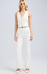 We all love a staple vest for the warmer seasons. The Isadora is a perfect style for your dressy to everyday rotation. Featuring a classic fitted vest silhouette, gold button front, v neckline and a bright white color. Style with the classic Katina Crepe Bermuda shorts and heels for a polished party vibe.