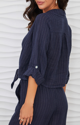 A classic pinstripe button up featuring a tie front detail, cuffed sleeves and an ultra relaxed summer fit. Style with the matching pants and slides for a polished yet laid back vibe.