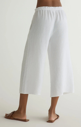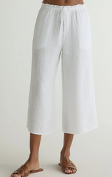 A playful pair of cropped wide leg pants. These summer staple bottoms are perfect for any day. Featuring a ruffle tie waistline, wide leg, cropped length and breezy linen. Style with the matching boat neck tank and sandals.