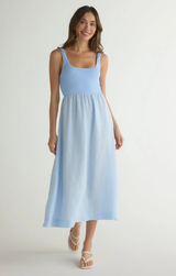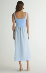 All day comfort in this easy to wear knit combo dress for summer. Featuring a scoop neckline, fitted knit top, flowy midi length skirt and periwinkle blue hue. Style with mules and gold jewelry for an effortlessly chic look.