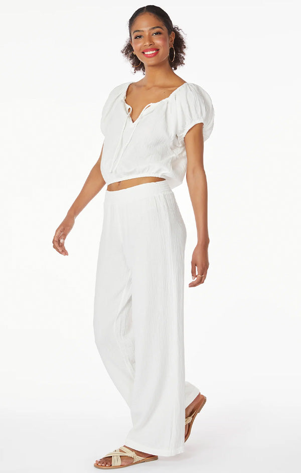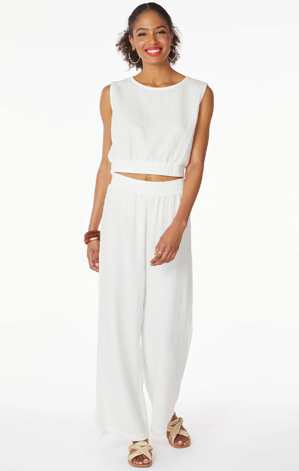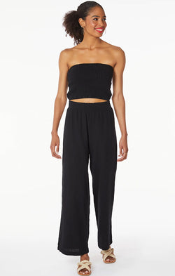 We love an easy tube tank for the hot months of summer. This cute and casual top features a fully smocked bodice, strapless style and cropped. Style with the matching pants and a slides for a laid back summertime look.