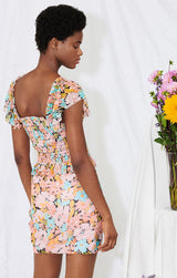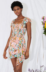 A pretty and feminine dress in a retro floral print. Featuring a smocked top, flutter cap sleeve, side draped skirt. The straps can be worn on or off the shoulders for a versatile look. Style with a chic pair of heels and a sleek clutch for a fun summer party look.