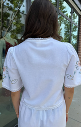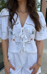 The Marilla Top is your go-to piece for summer getaways. This short sleeve top features a charming tie-front closure that creates cute little bows, delicate embroidered details, a slightly cropped length, and a textured trim that frames the sleeves, front opening, and hem. Pairs perfectly with the Olvera Short for a complete look that's equal parts fun and put-together.