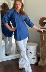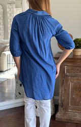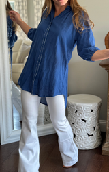 The Ava is breezy in blue and ever so versatile! Featuring a classic collared neckline, button front closure, a long length that allows it to double as a cute coverup, and chic contrast embroidered details along the collar and front closure. Style with leggings and sneakers, or with denim shorts and sandals!