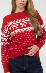 This sweet pullover is everything we are looking for in our holiday knits. Featuring a crew neck, long sleeves, relaxed cozy fit and sweet festive pattern. Style with a faux leather mini skirts and boots for a party ready look.